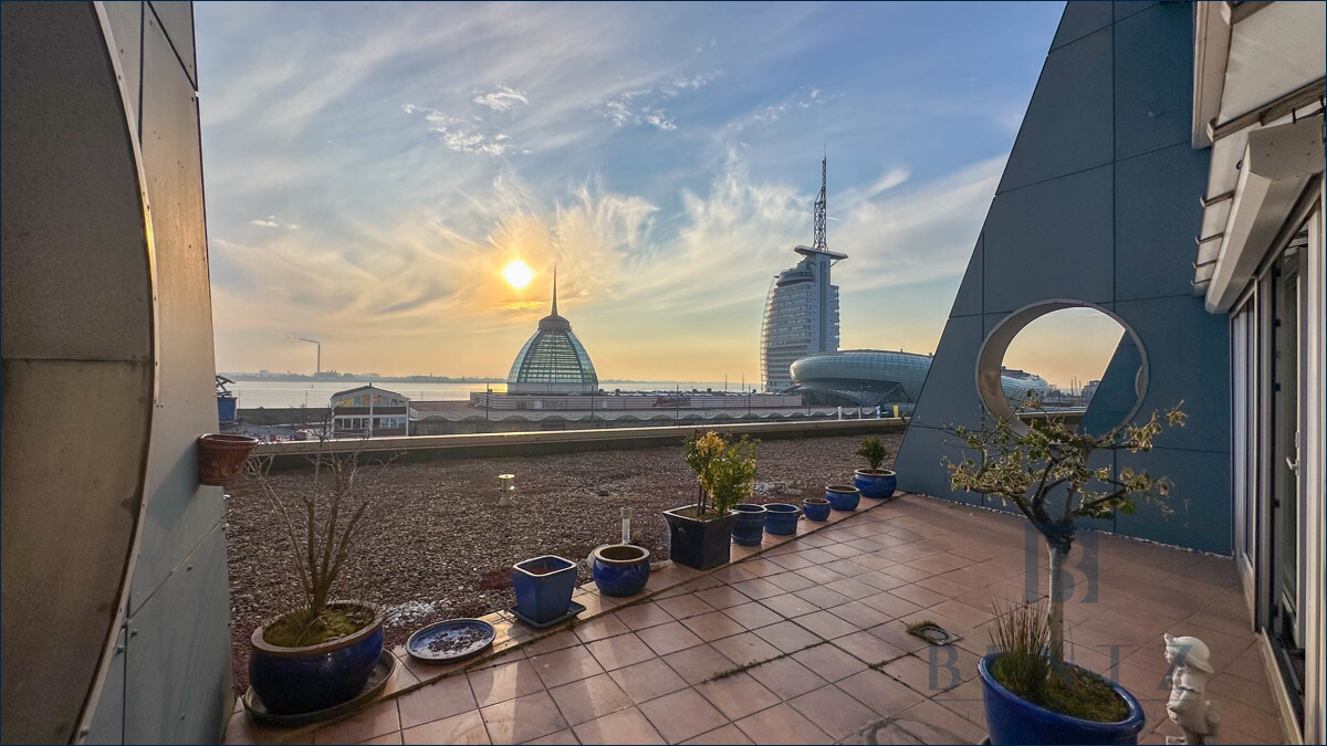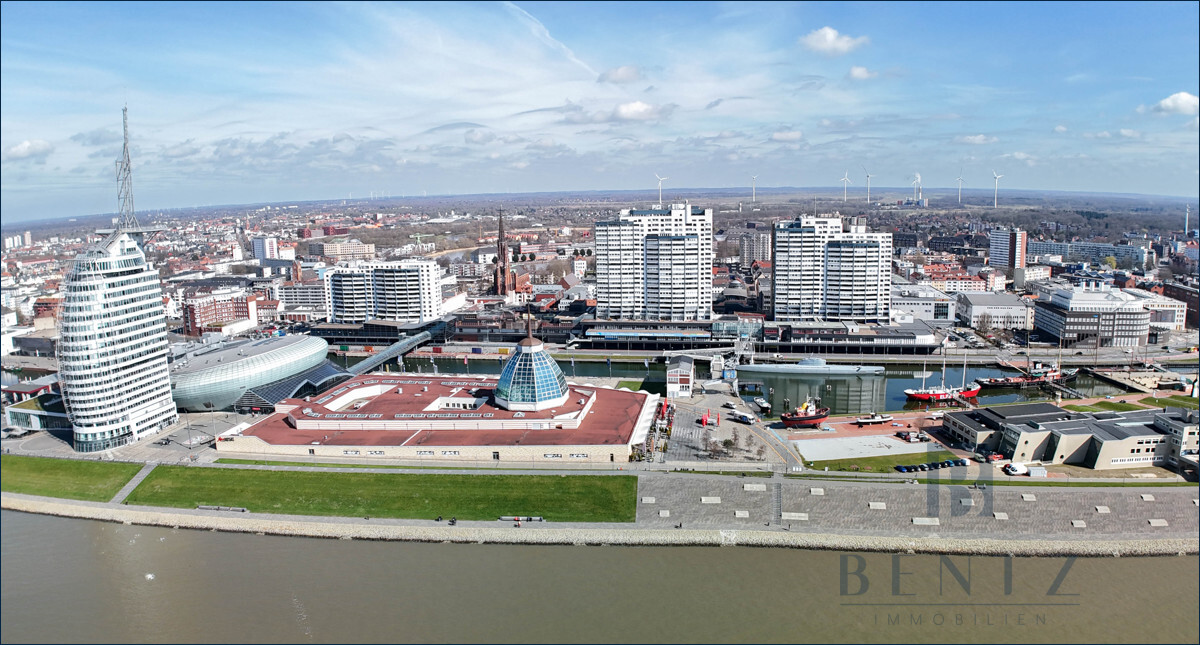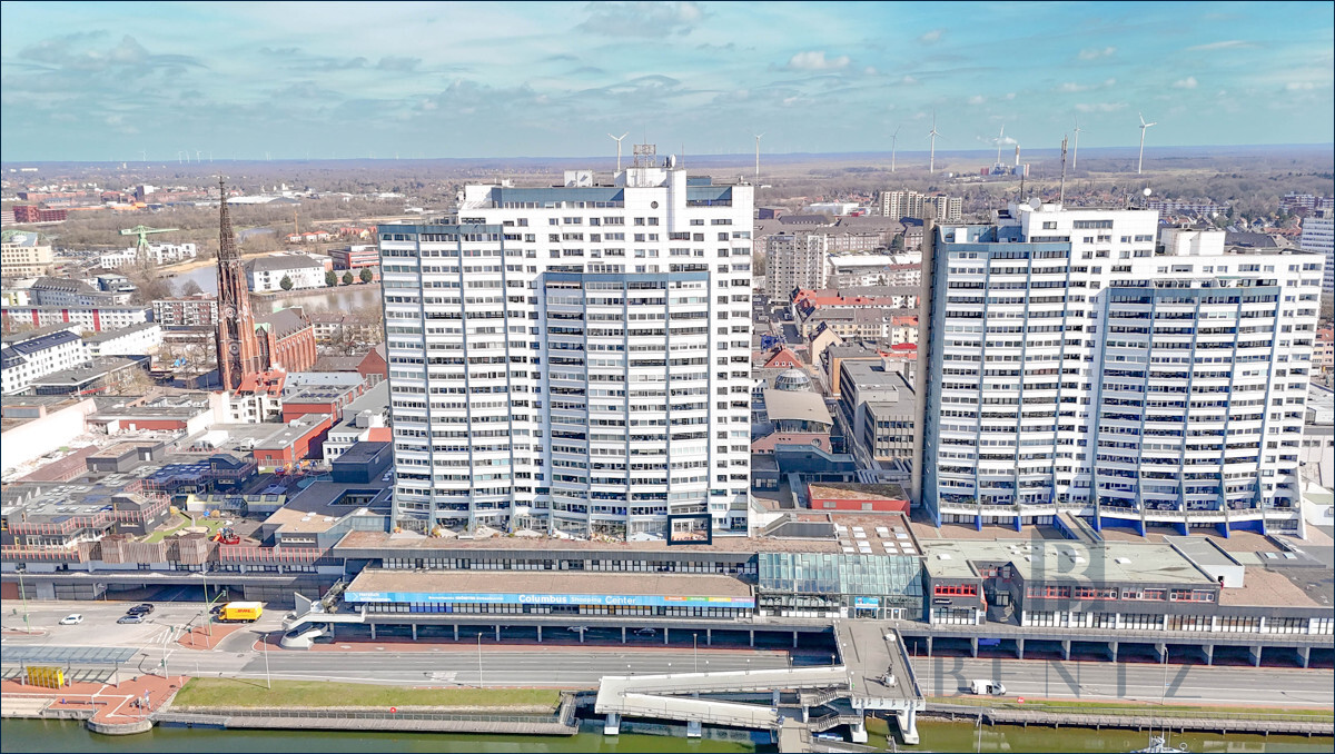 Genießen Sie den Ausblick und die Sonne im Herzen Bremerhavens. Diese neuwertige, lichtdurchflutete 2- Zimmer Wohnung überzeugt auf ganzer Linie und vermittelt Ihnen durch die besondere Aussicht, ganzjährig ein Urlaubsgefühl. Die Highlights hierbei sind der Wintergarten sowie die Terrasse mit beeindruckender Aussicht auf die Wesermündung und die Wahrzeichen Bremerhavens. Die Wohnung ist größtenteils barrierefrei und mit einem Fahrstuhl erreichbar. Über den Flur gelangen Sie direkt in das Wohnzimmer, welches mit hochwertigem Parkett ausgestattet ist. Ein besonderer Blickfang sind die Fenster, die sich über die komplette Wand erstrecken und über den Wintergarten den Zugang zur Terrasse ermöglicht. Die Geräte in der angrenzenden, offenen Küche sowie das Badezimmer, wurden erst 2023 erneuert. Vom lichtdurchfluteten Schlafzimmer haben Sie ebenfalls einen direkten Zugang auf die Terrasse haben.Um das Urlaubsgefühl abzurunden, befindet sich in der 25. Etage ein Schwimmbad, welches den Hausbewohnern zur Entspannung dient. PKW-Stellplätze im Parkhaus des Columbus Shopping Centers können angemietet werden. Von dort aus gelangen Sie mit dem Fahrstuhl direkt auf Ihre Etage. Zusätzlich steht Ihnen ein Abstellraum im Hausflur zur Verfügung.